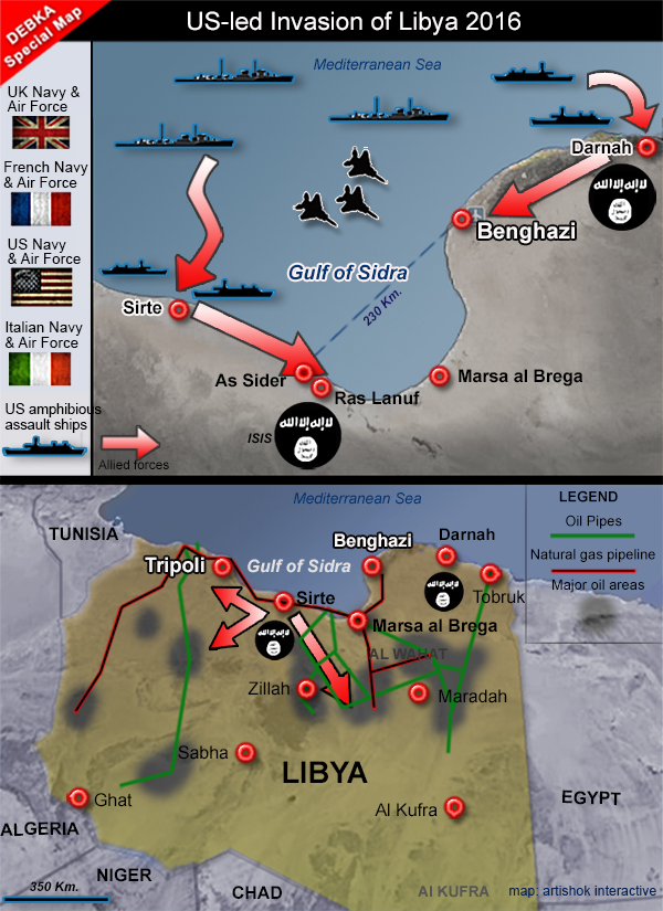 Bár többek között az olasz külügyminisztérium is tagadta, hogy tervbe lenne véve egy szárazföldi támadás, a Debka nevű izraeli hírszerző ügynökség beszámolója szerint január végén amerikai, orosz, brit, olasz és francia különleges egységek szállak partra Tobruktól délre, közel a líbiai-egyiptomi határhoz. Az orosz jelenlét igencsak kérdéses, és az izraeli portál sem tudta meggyőző bizonyítékokkal alátámasztani, egy közös amerikai-brit-francia-olasz együttműködés már korábban is többször szóba került. A Debka által közölt térképen a szövetséges inváziós erők két helyen szállnának partra. A darnah-i partraszállás sikere esetén Bengházi elérhető közelsége kerül, míg Szirte bevétele lehetővé tenné Tripoli, Miszráta visszavételét, ezáltal pedig a nyugati országok átvennék az ellenőrzést Líbia olaj-, és gázmezői felett (ld. mellékelt térképek). Mindez a Nyugat állandó katonai jelenlétét vonná maga után, hiszen korábban a nyugati érdekeltségéket (főleg brit) katonai magáncégek őrizték az országban, most ez a feladat a koalíciós csapatokra hárulna. Kérdéses, hogy ezek a tervek gyakorlati megvalósításra kerülnek-e valaha is, egyelőre csak az biztos, hogy a nyugati beavatkozás eddig kizárólag a Haftar-kormányzatnak küldött fegyverszállítmányokban, képzésekben és légicsapásokban realizálódott.