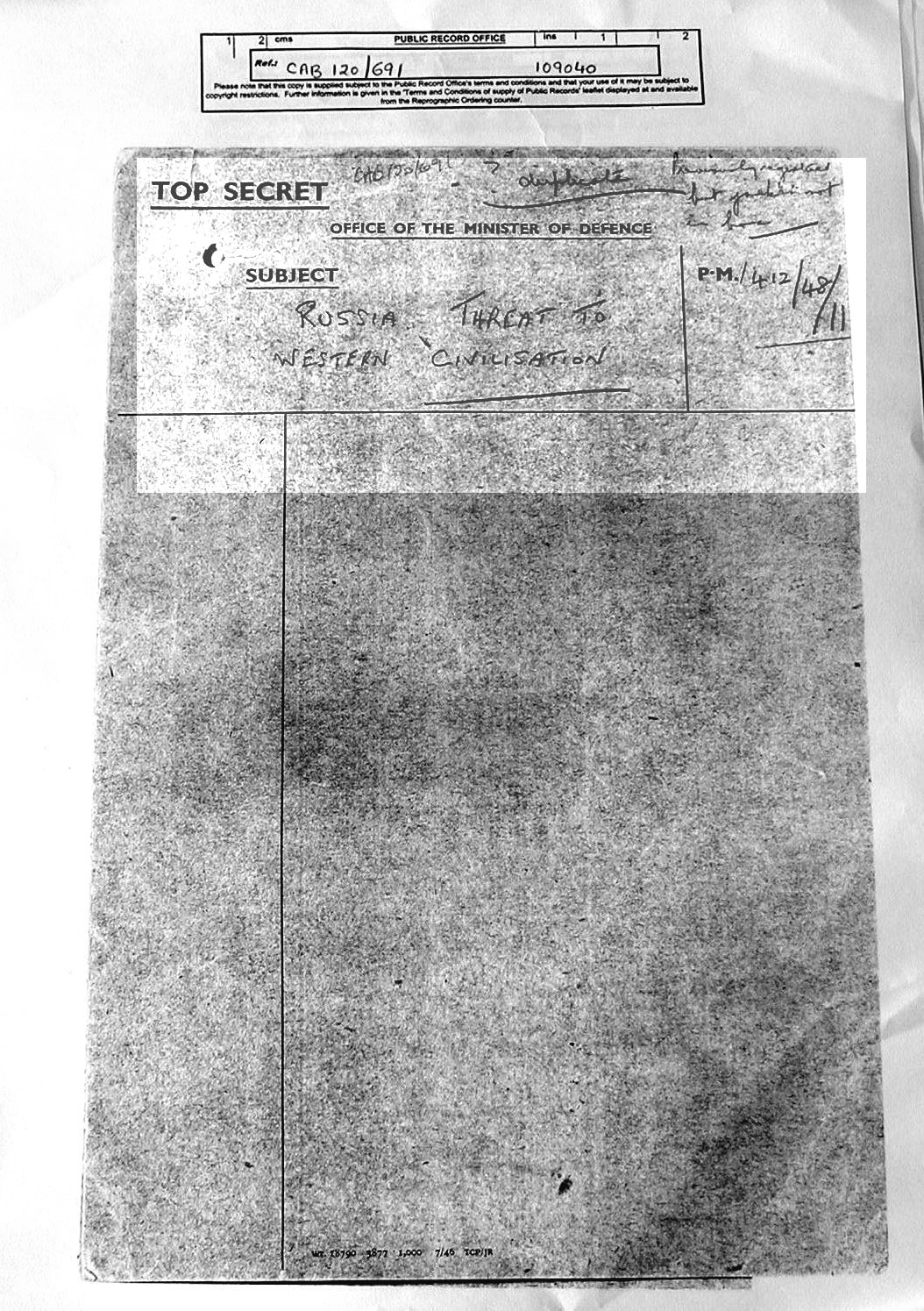Az „Operation Unthinkable: „Oroszország: fenyegetés a nyugati civilizációra” c. jelentés fedlapja (British War Cabinet, Joint Planning Staff [1945. máj. 22. jún. 8., júl. 11.]), Public Record Office, CAB 120/691/109040/001.)