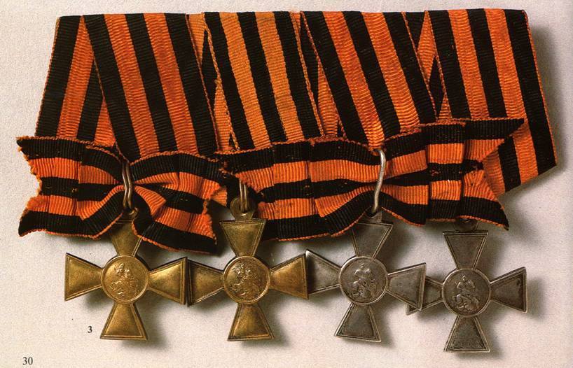 A Szent György érdemrend mind a négy fokozata (a III. és I. osztály éremszalagján volt egy vízszintes masni).