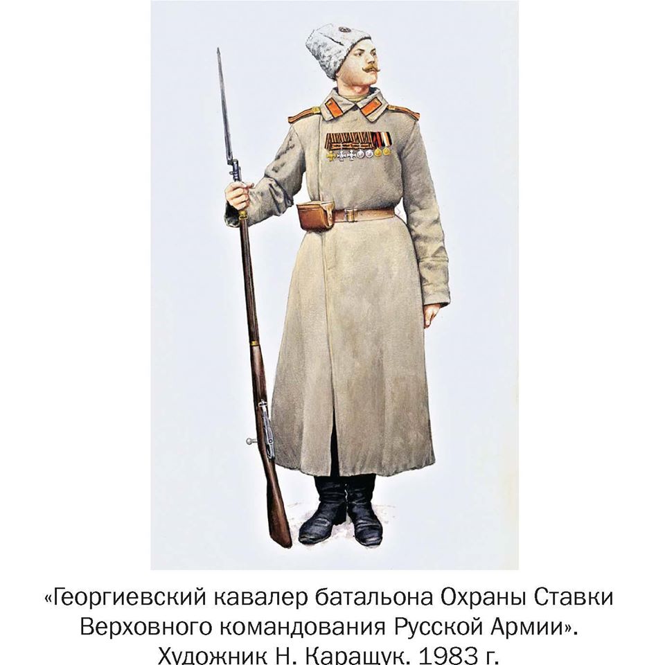 – tisztek számára: – a Sztavka őrzését ellátó György-zászlóalj vállapjai, ,,Sz.G.” betűkóddal, és alatta az ezred számával; az ing hajtókáján – György-szalag, ¼ inch szélességgel, az ujjakon – narancssárga paszomány, a nadrágokon – széles arany huszár sújtás, 1 inch szélességben (tiszti); a galléron – György-szalagból készült parolik, narancssárga szegéllyel; a téli (,,színes”) sapka (a tábori viseleten kívül) a 13. dragonyos, Hadi Érdemrend nevét viselő ezrednél rendszeresített minta szerint (sapka felső része fehér, alsó fekete, szegély és zsinórozás narancssárga);