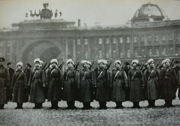 Az 1. Petrográdi női zászlóalj a Téli Palota előtt. 1917 októbere.